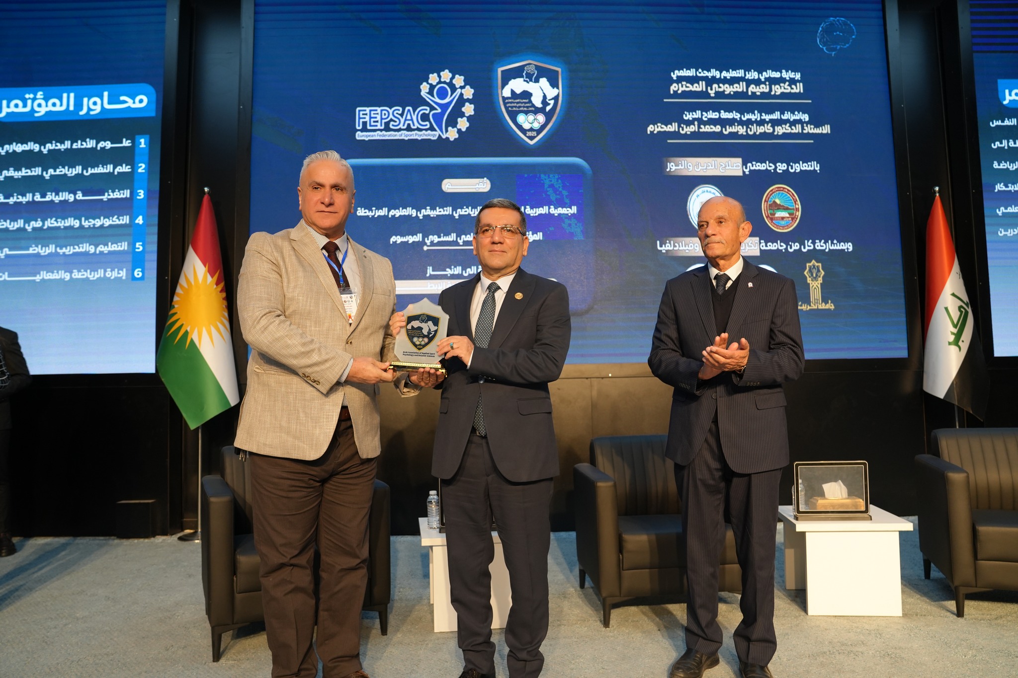 In a gesture of appreciation reflecting the spirit of academic partnership, the media lens documented The president of the Arab society for Applied Sports Psychology and related sciences, professor Dr. Nazem al-Watar, honored the heads of academic institutions supporting the scientific conference Organized by the association in Erbil city – Kurdistan region of Iraq, And on Rehab Salah al-Din University. This honor comes in appreciation of the active scientific and institutional role in supporting scientific research and enhancing the paths of joint academic cooperation.